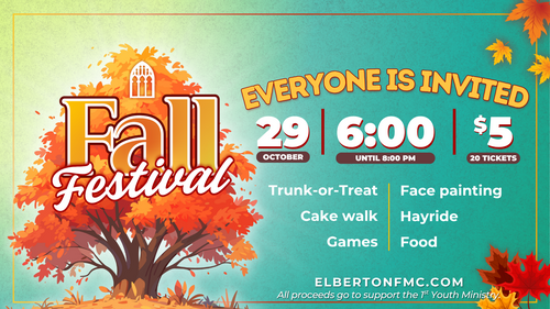 The Annual 1st Youth Fall Festival will be on Wednesday, October 29th, from 6-8 pm. We will have games, food, a cakewalk, a hayride, and trunk or treat. If you would like to donate baked goods for the cakewalk or candy for the games, please tell Bryce Keely, Youth Director. His email is bryce@elbertonfmc.com